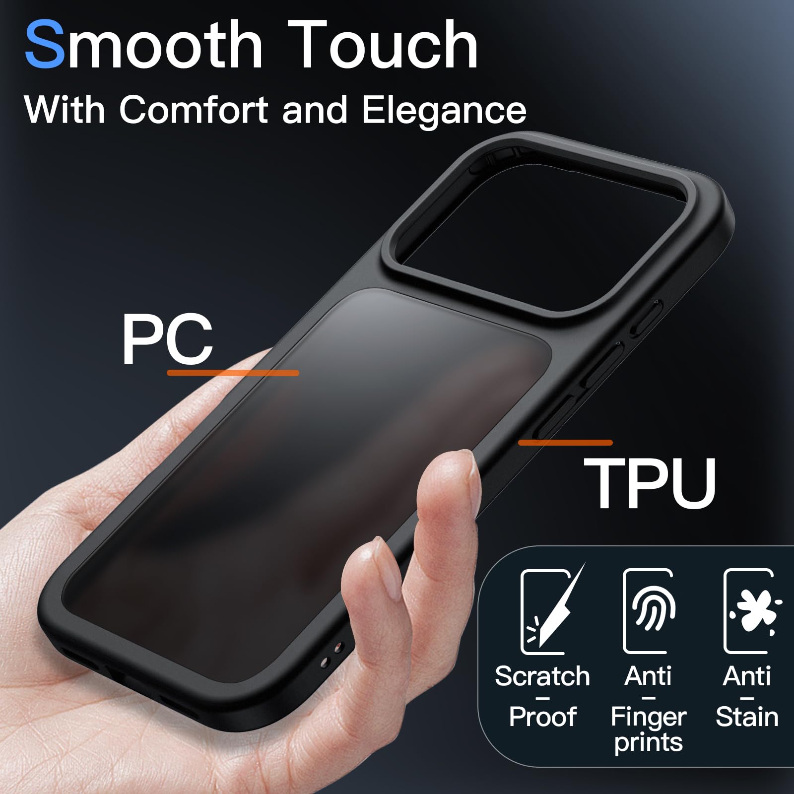 • [Translucent Design] This hybrid case combines flexible TPU frame with hard matte PC back, delivering a smooth touch that resists fingerprints and oil smudges while showcasing your phone’s delicate logo