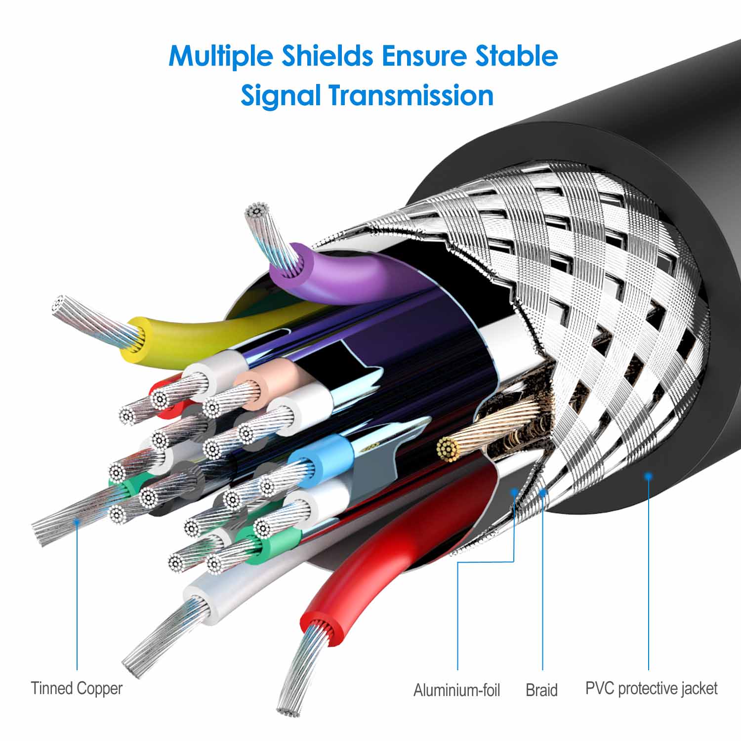 The gold-plated conductors resist corrosion and increase connectivity. The inner braided foil shielding reduces interference and improves signal quality
