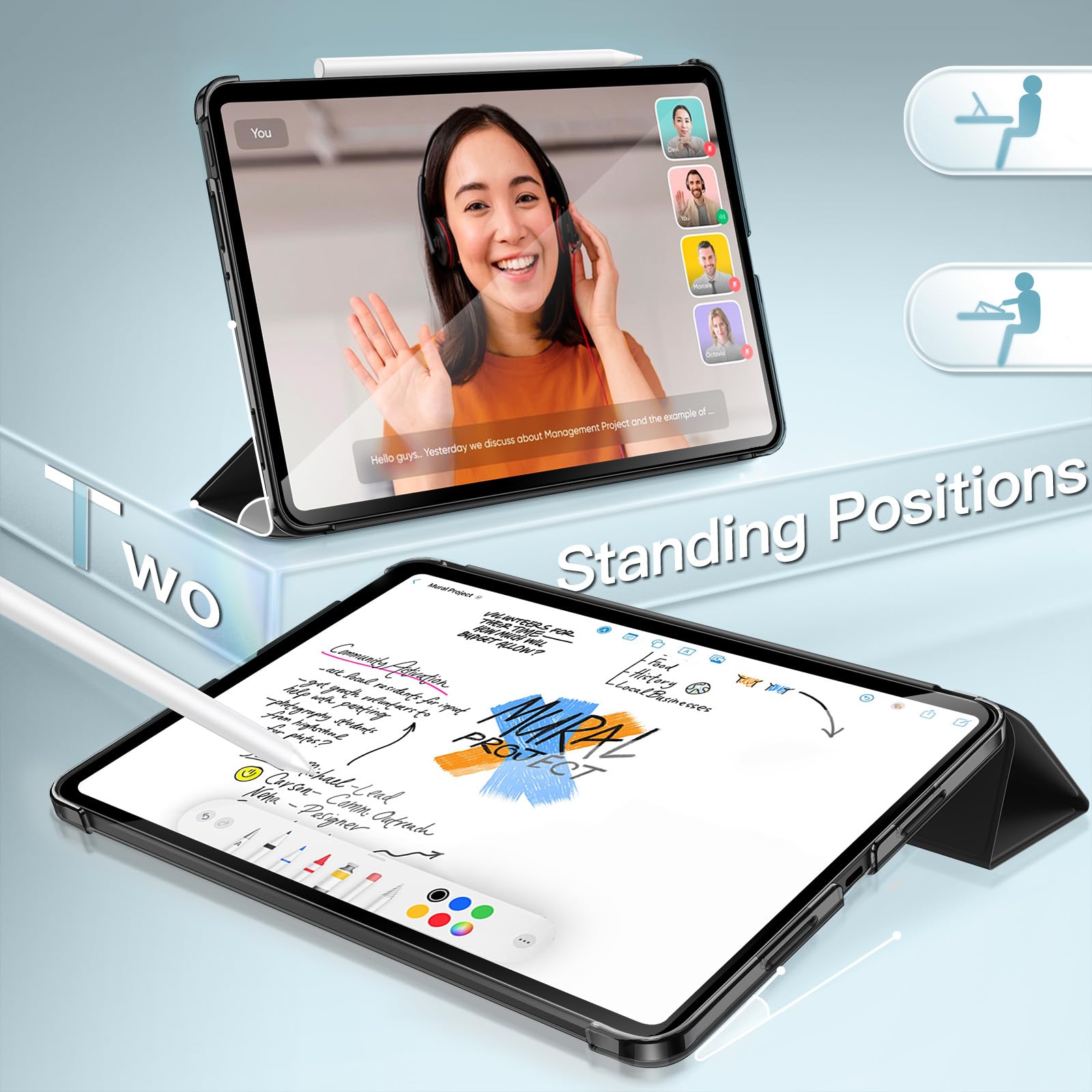 [Tri-Fold Stand Cover] The front cover can be folded into a stand, providing two adjustable viewing angles for comfortable typing, watching, or browsing