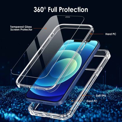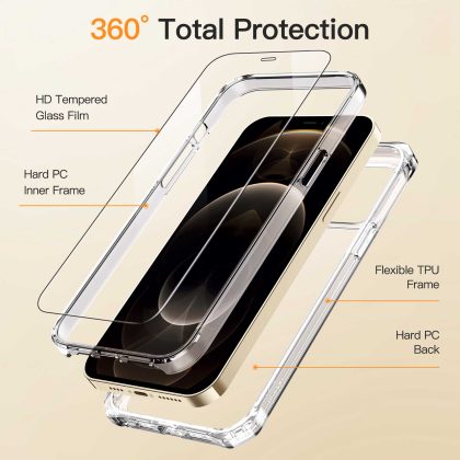 JETech Case for iPhone 12/12 Pro 6.1-Inch with 2-Pack Tempered Glass Screen Protector, 360 Full Body Shockproof Bumper Phone Cover Protective Clear Back